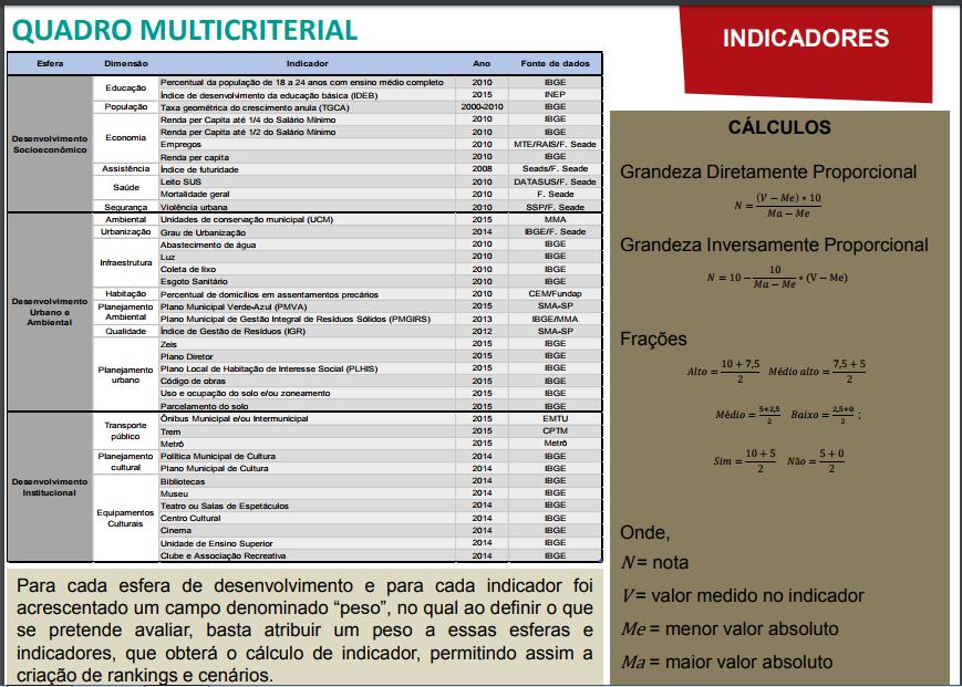 Para efeito de comparação dos municípios, foram selecionados os seguintes indicadores, oficiais:
