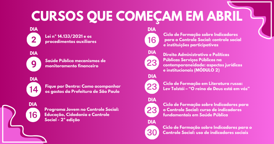 Aqui você fica sabendo quais os cursos que estão sendo oferecidos pela Escola Superior de Gestão e Contas Públicas (EGC), a Escola de Governo do Tribunal de Contas do Município de São Paulo, para este mês de abril.