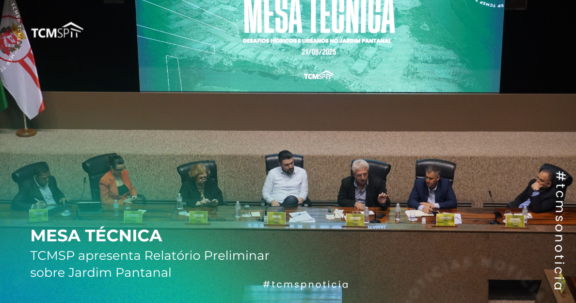 O Tribunal de Contas do Município de São Paulo (TCMSP) realizou, nesta quinta-feira (21/08), a Mesa Técnica “Desafios de segurança hídrica: soluções com foco em gestão de risco e planejamento urbano no Jardim Pantanal”, ocasião em que apresentou o Relatório Preliminar da Auditoria Programada sobre Gestão de Áreas Permeáveis. O encontro reuniu secretários municipais, representantes do Executivo e do Legislativo, Governo do Estado por meio da SP Águas, além de entidades, especialistas, sociedade civil organizada e técnicos do Tribunal.