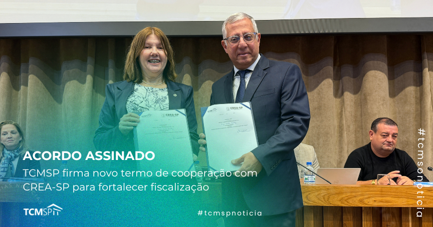 O Tribunal de Contas do Município de São Paulo (TCMSP) participou, nesta quinta-feira (25), do evento de assinatura do novo Termo de Cooperação Técnica e Institucional com o Conselho Regional de Engenharia e Agronomia do Estado de São Paulo (CREA-SP), realizado no Plenário do CREA-SP. O acordo foi firmado pela Presidente do órgão, engenheira civil Lígia Marta Mackey, e pelo Chefe de Gabinete da Presidência do TCMSP, Rubens Chammas - que representou o Presidente do Tribunal, Conselheiro Domingos Dissei.