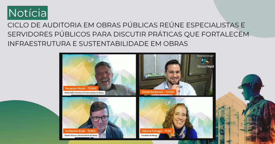 A Escola Superior de Gestão e Contas Públicas (EGC), vinculada ao Tribunal de Contas do Município de São Paulo, realizou mais uma edição do ciclo “Auditoria em Obras Públicas, Infraestrutura e Sustentabilidade”, trazendo ao debate os novos procedimentos de auditoria elaborados pelo IBRAOP - Instituto Brasileiro de Auditoria de Obras Públicas, bem como sua aplicação na melhoria da gestão de obras municipais. A palestra online teve transmissão ao vivo pelo canal da EGC no Youtube.
